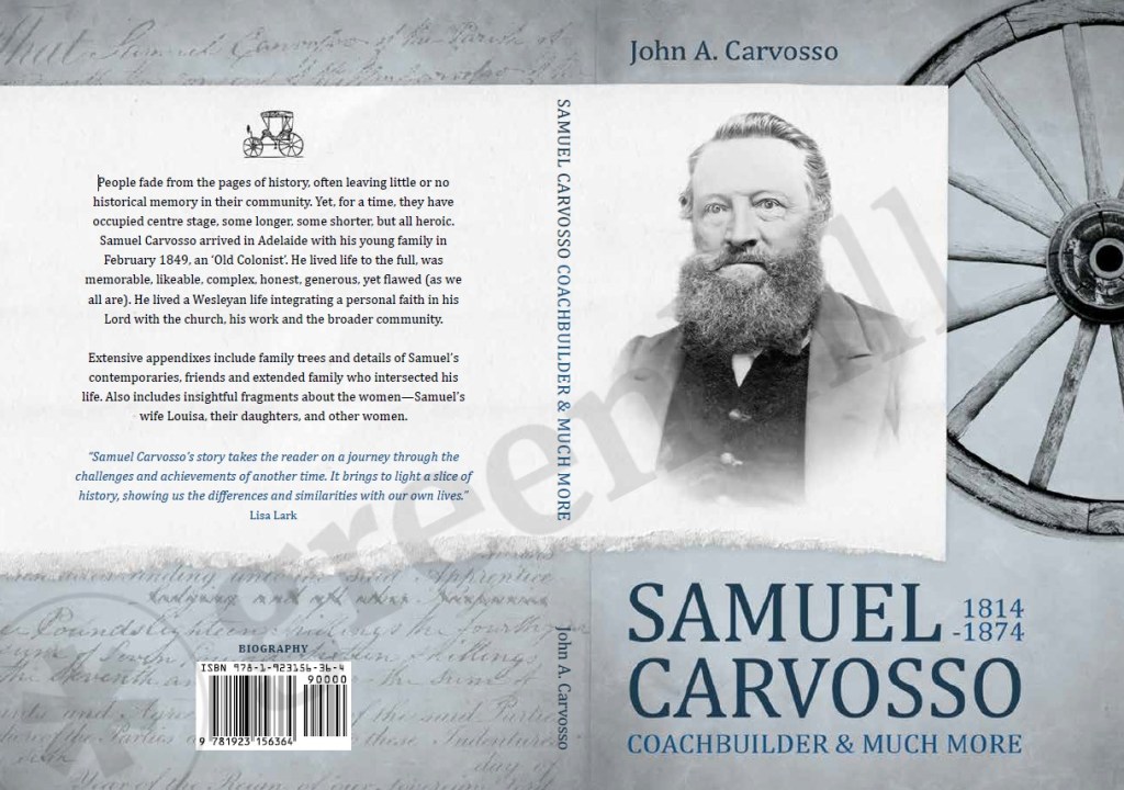 Amazon ***** “John’s book is a fascinating look at an early part of South Australia’s colonial history. The writing style is very accessible. The research on Samuel Carvosso’s family move from Cornwall to South Australia is thorough and interesting. The story is familiar to anyone who has a grasp of South Australian history – the long voyage, the landing, Adelaide’s growth as a middle-class city, the mining adventures and so on. Samuel was a hearty small businessman fully participating in the life of the colony. Samuel was also an enthusiastic Cornish Wesleyan, or Methodist, as were many of the settlers at the time. The book is a nice complement to D. Pike’s seminal work on the early life of the colony, Paradise of Dissent. The book is well worth a read for those interested in early South Australian history.” by Peter Hill (Refer to Amazon Australia)