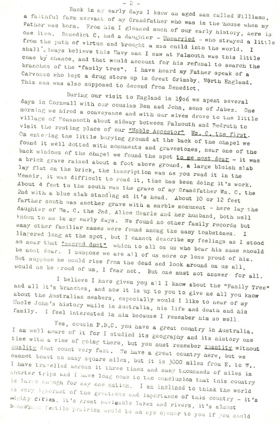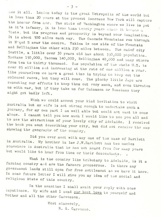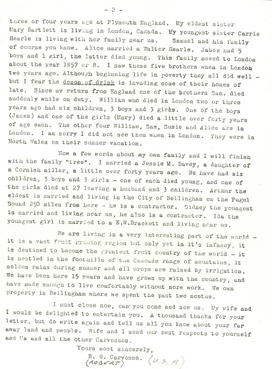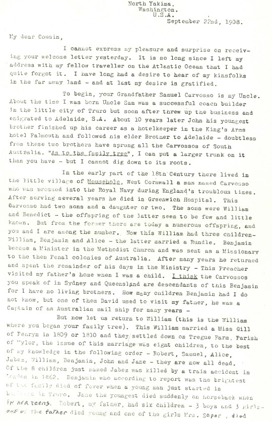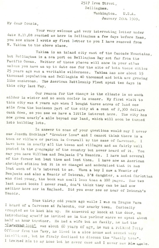 Back in the era of letter writing, here are two letter from Robert G Carvosso of Bellingham, Washington (state), USA to Percy Banks Carvosso of Adelaide, Australia. They met on an Atlantic crossing! It will be great if any USA cousins recognise who this Robert is!